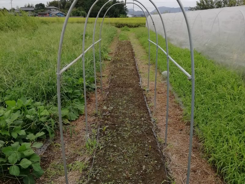 2週間前、苦土石灰を土に混ぜ込み きょう、牛ふん堆肥を入れた後で畝を耕うんし、ジャガイモの種芋を30㎝間隔で植えた後、黒マルチを張りました。
